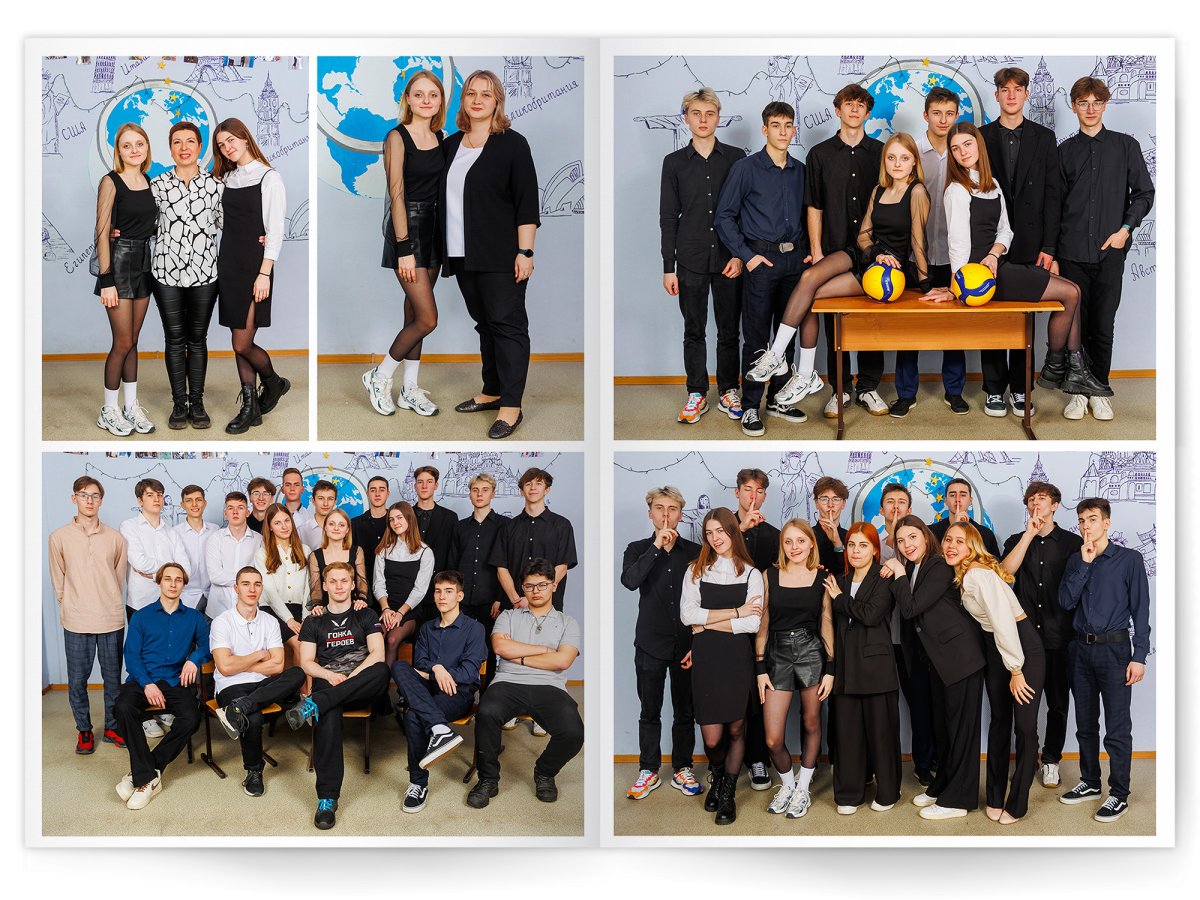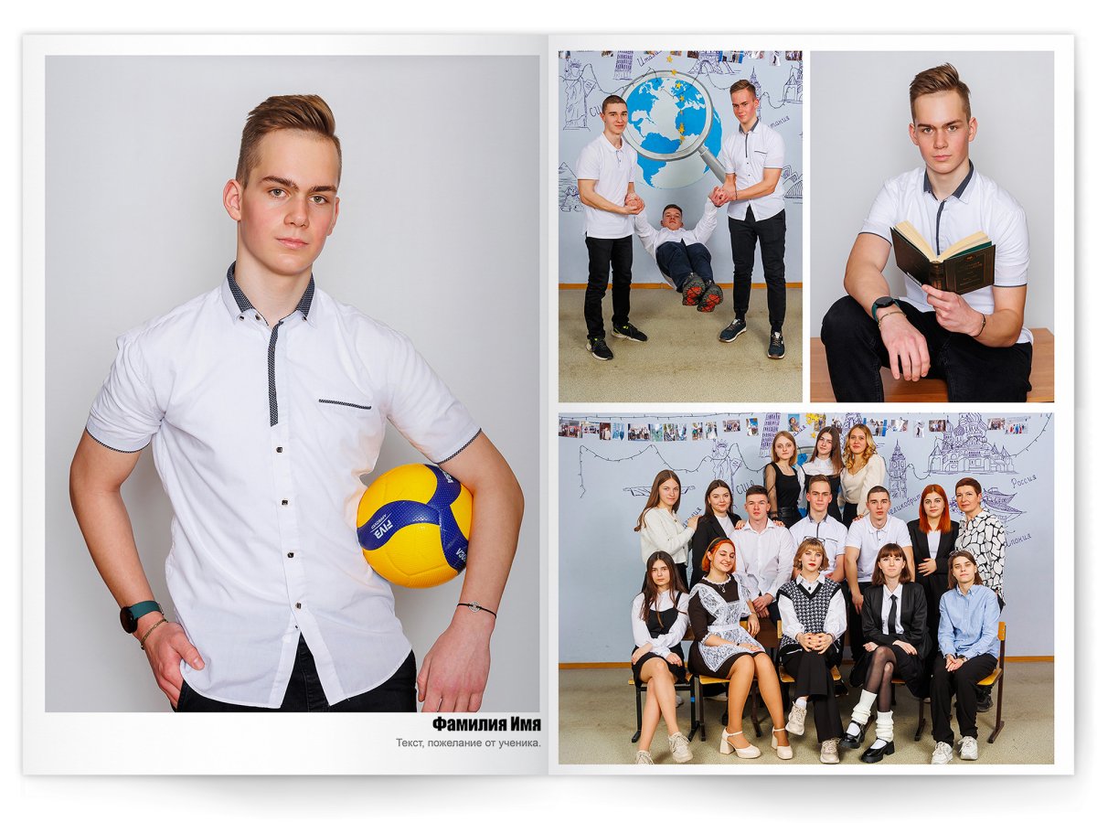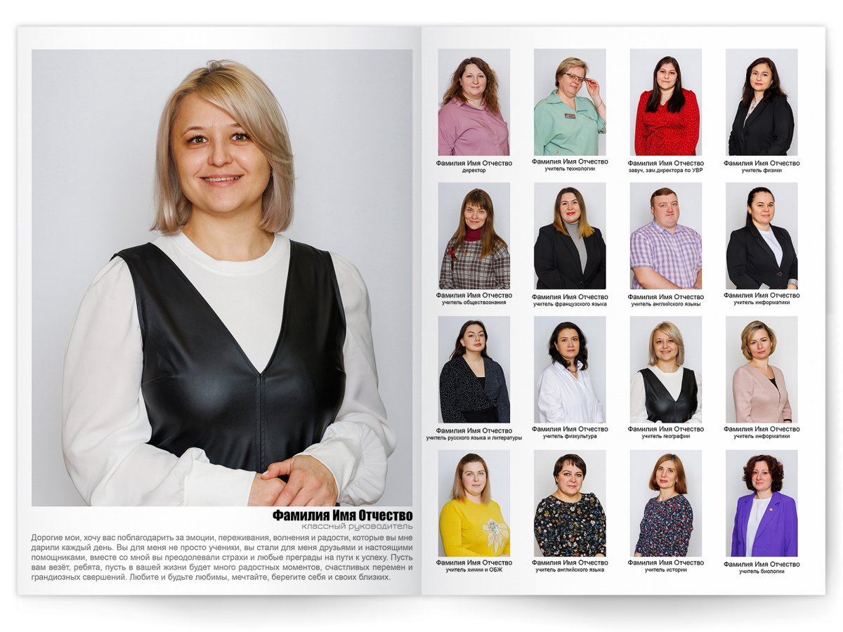 • Портреты всех одноклассников и все учителя, которые придут на съёмку на развороте