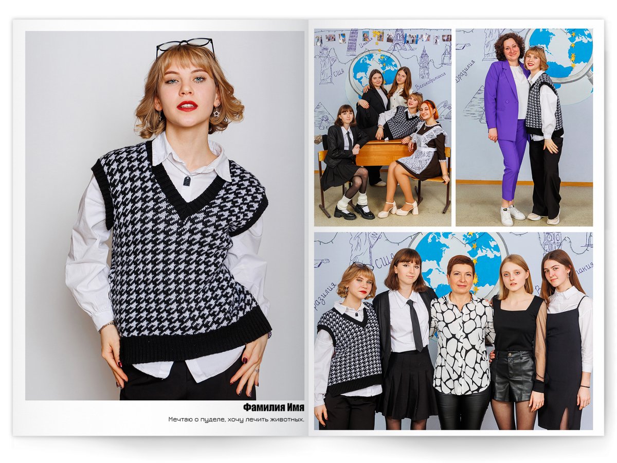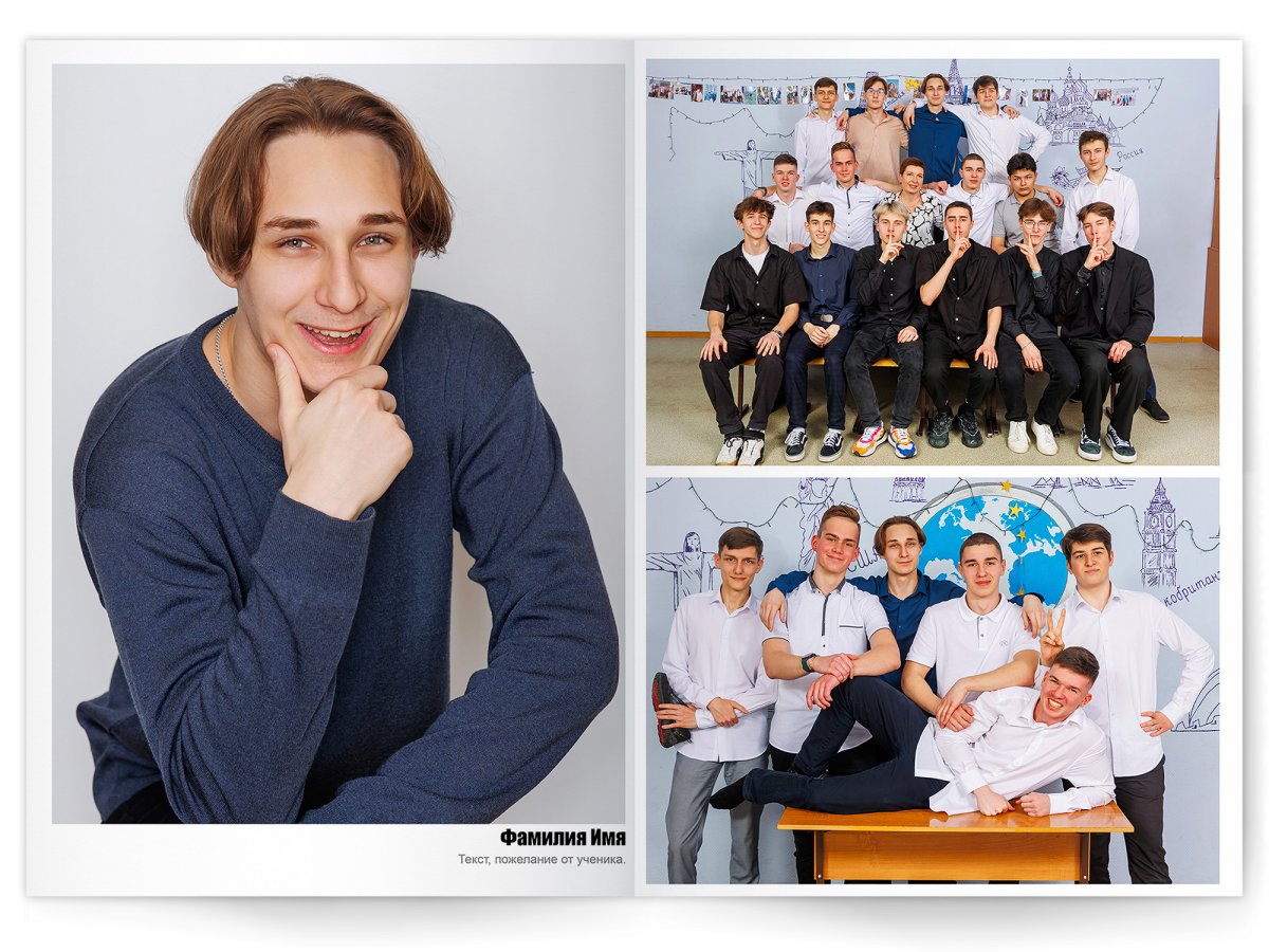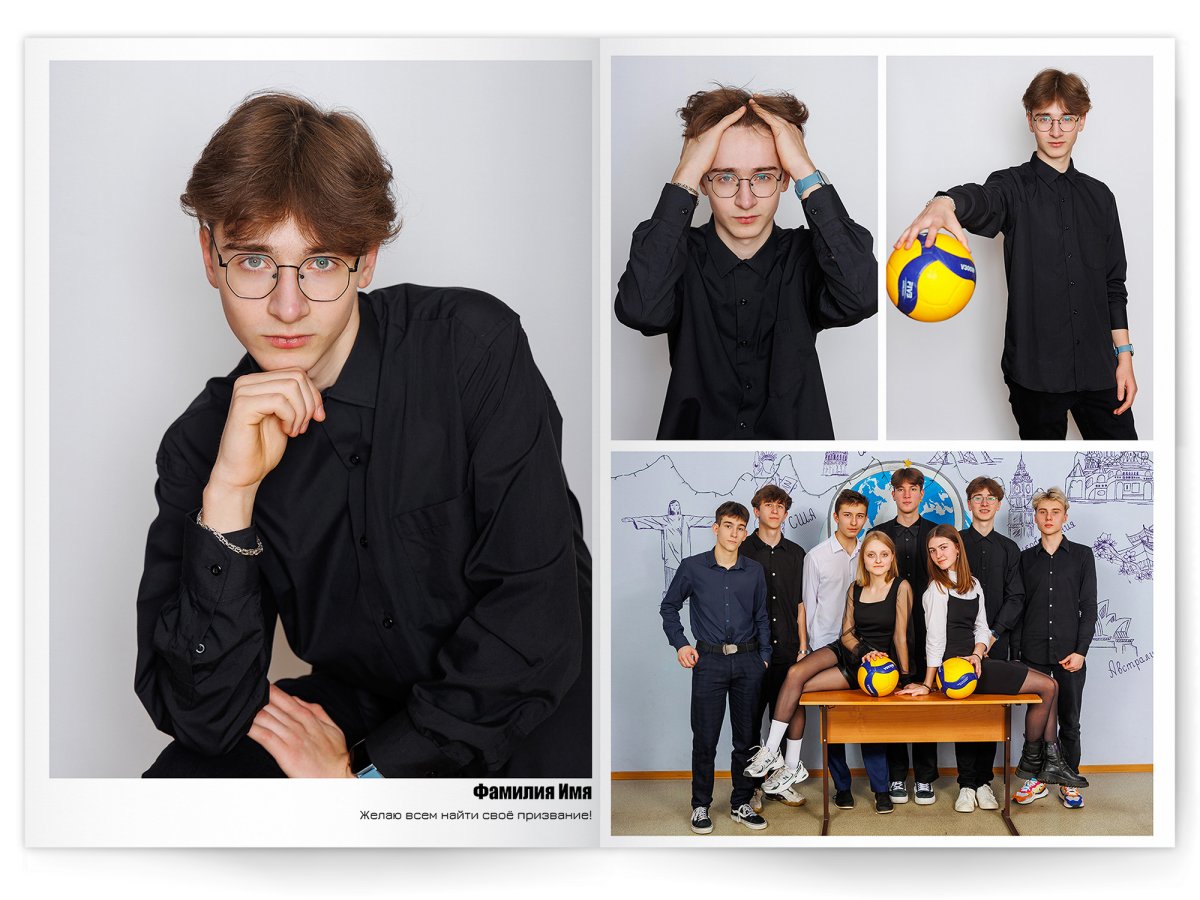 • Портреты всех одноклассников и все учителя, которые придут на съёмку на развороте