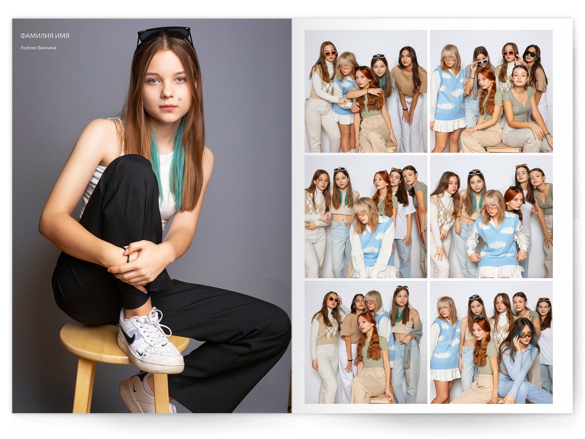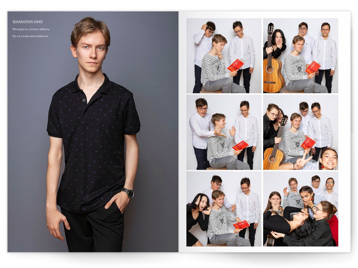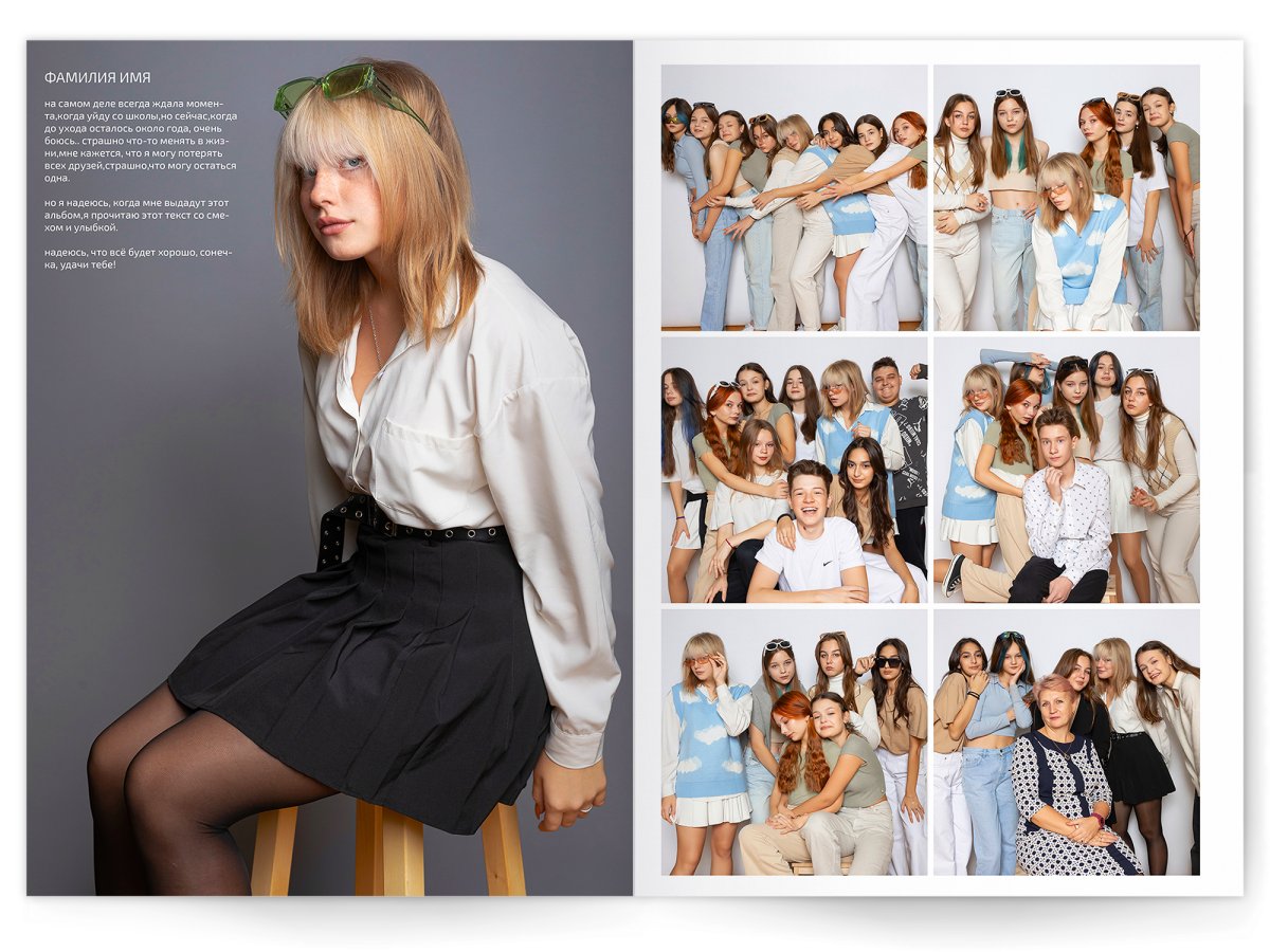 - Разворот с твоим портретом на всю страницу и от 2 до 4 фото на выбор