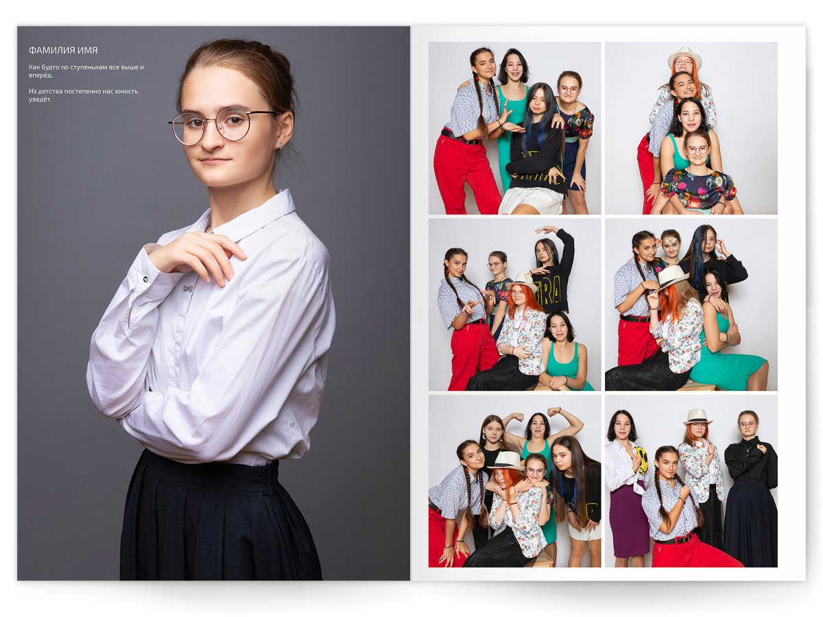 - Портреты всех одноклассников и все учителя, которые придут на съёмку на развороте