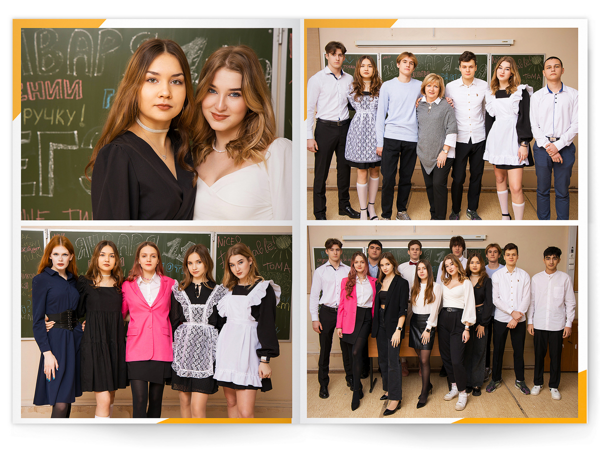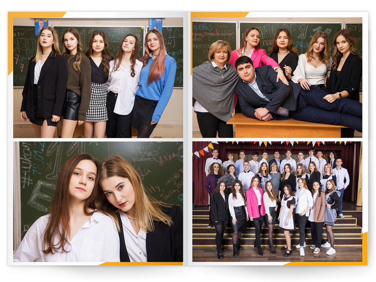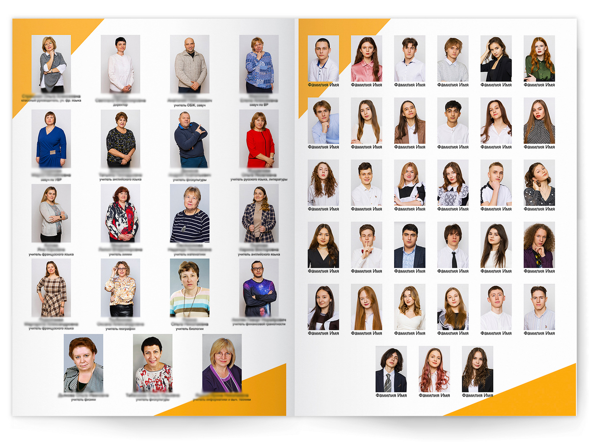 • Портреты всех одноклассников и все учителя, которые придут на съёмку на развороте
