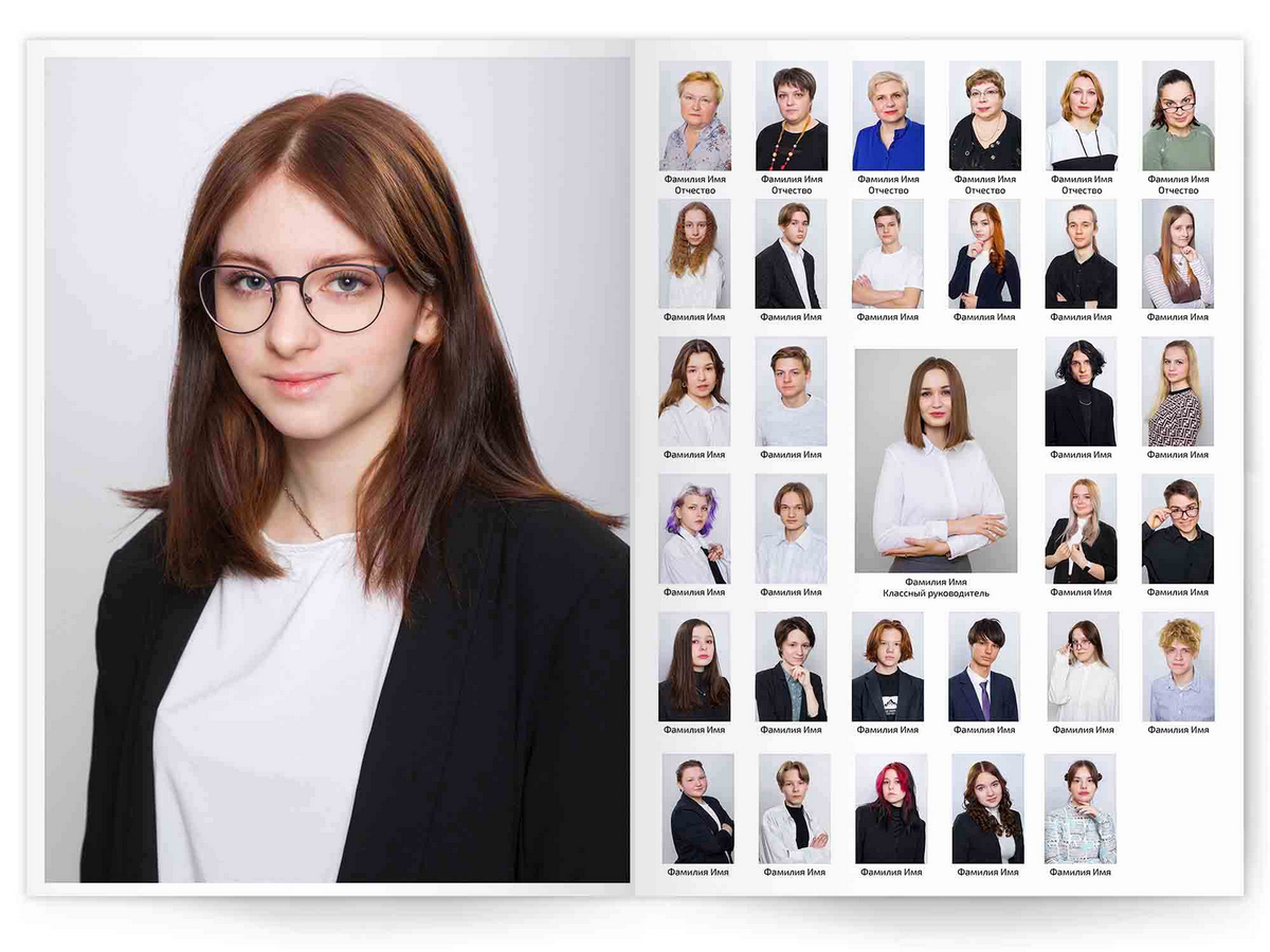 • Портреты всех одноклассников и все учителя, которые придут на съёмку на развороте
