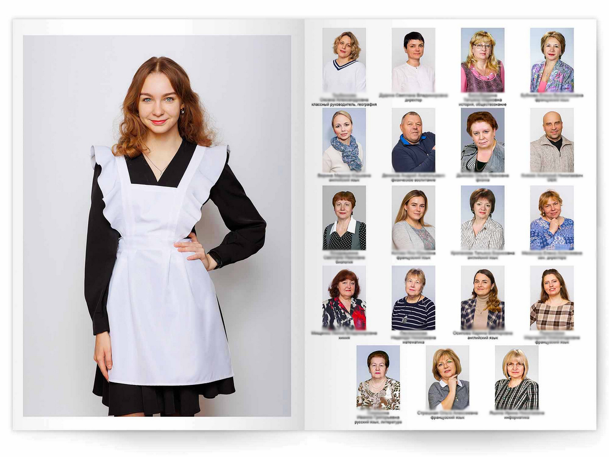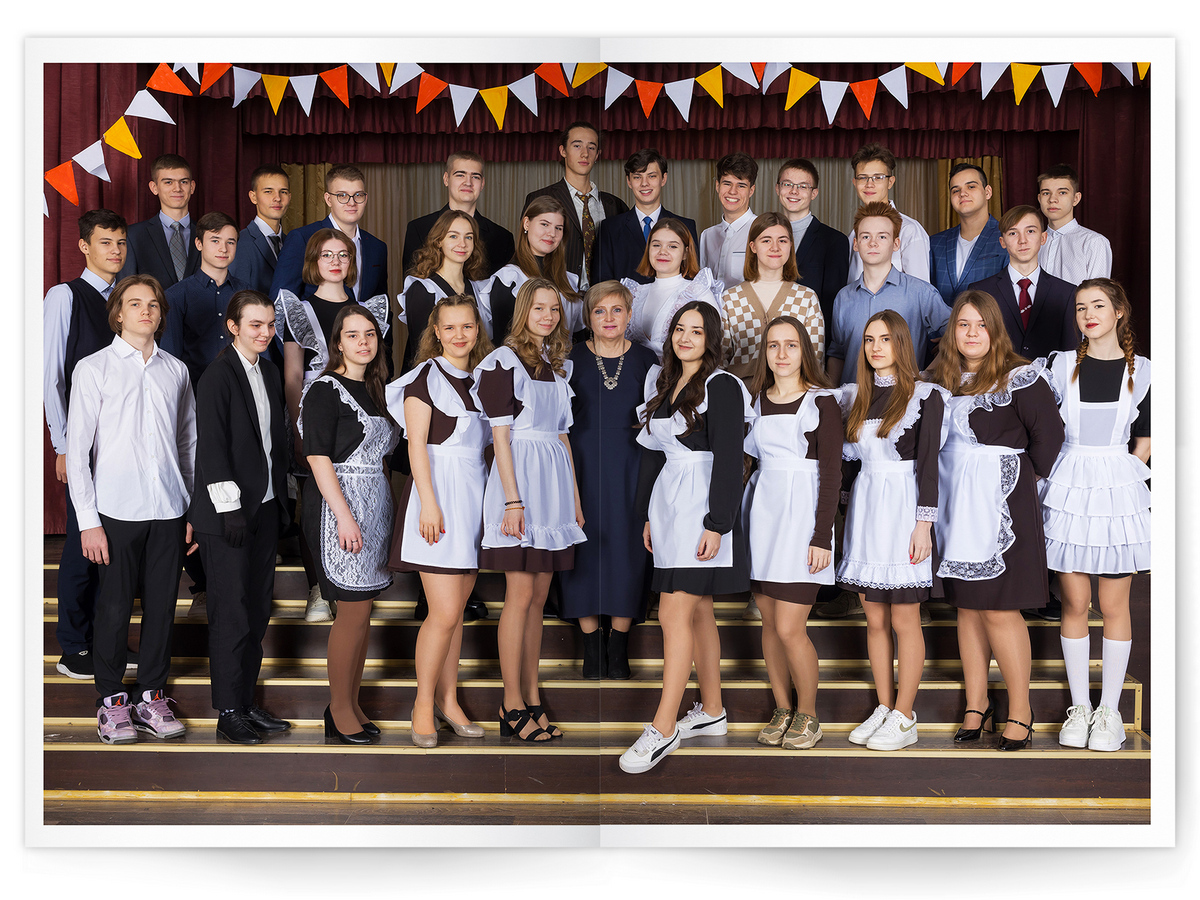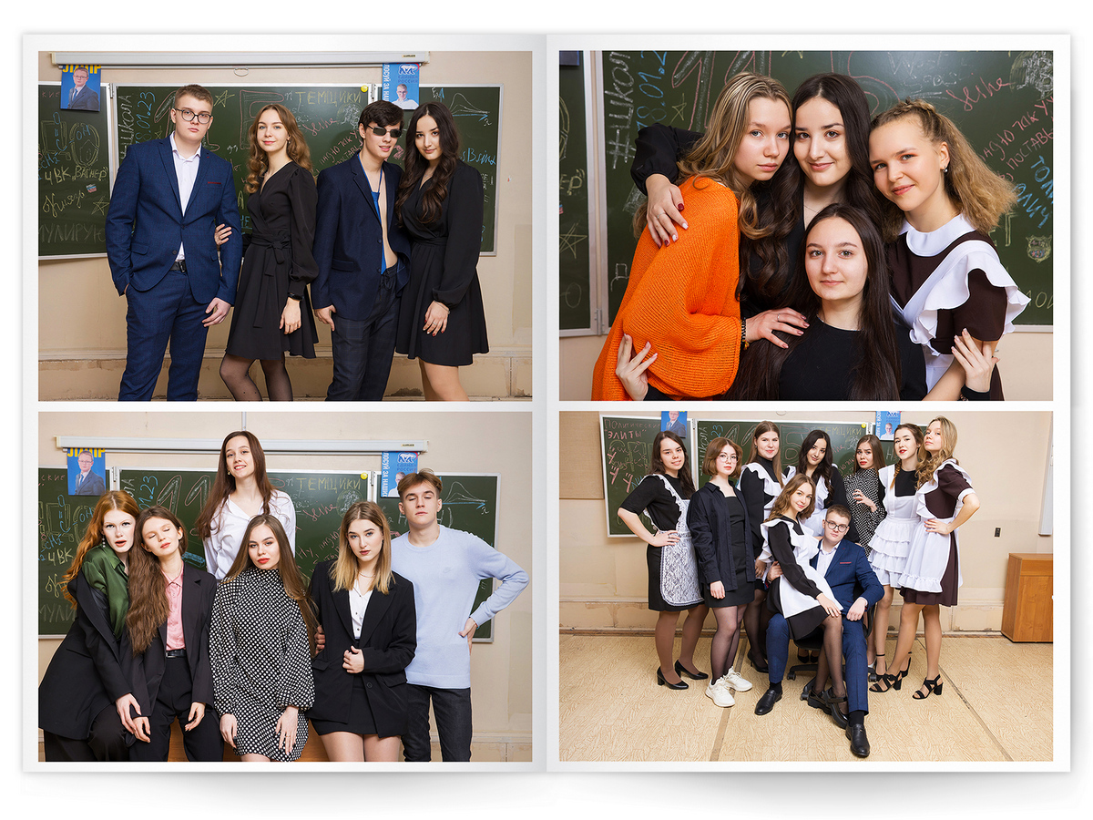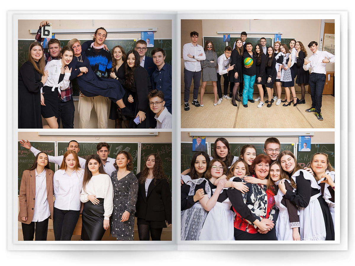 • Портреты всех одноклассников и все учителя, которые придут на съёмку на развороте