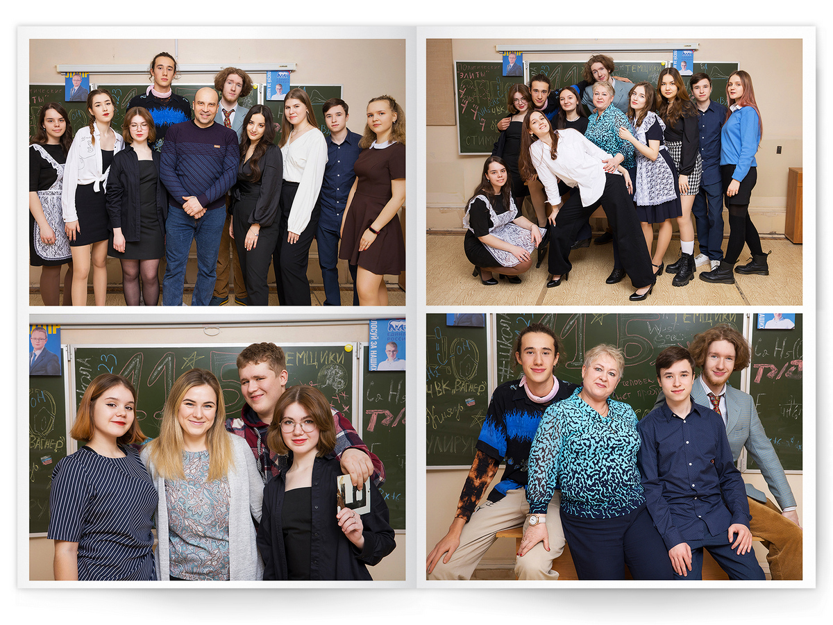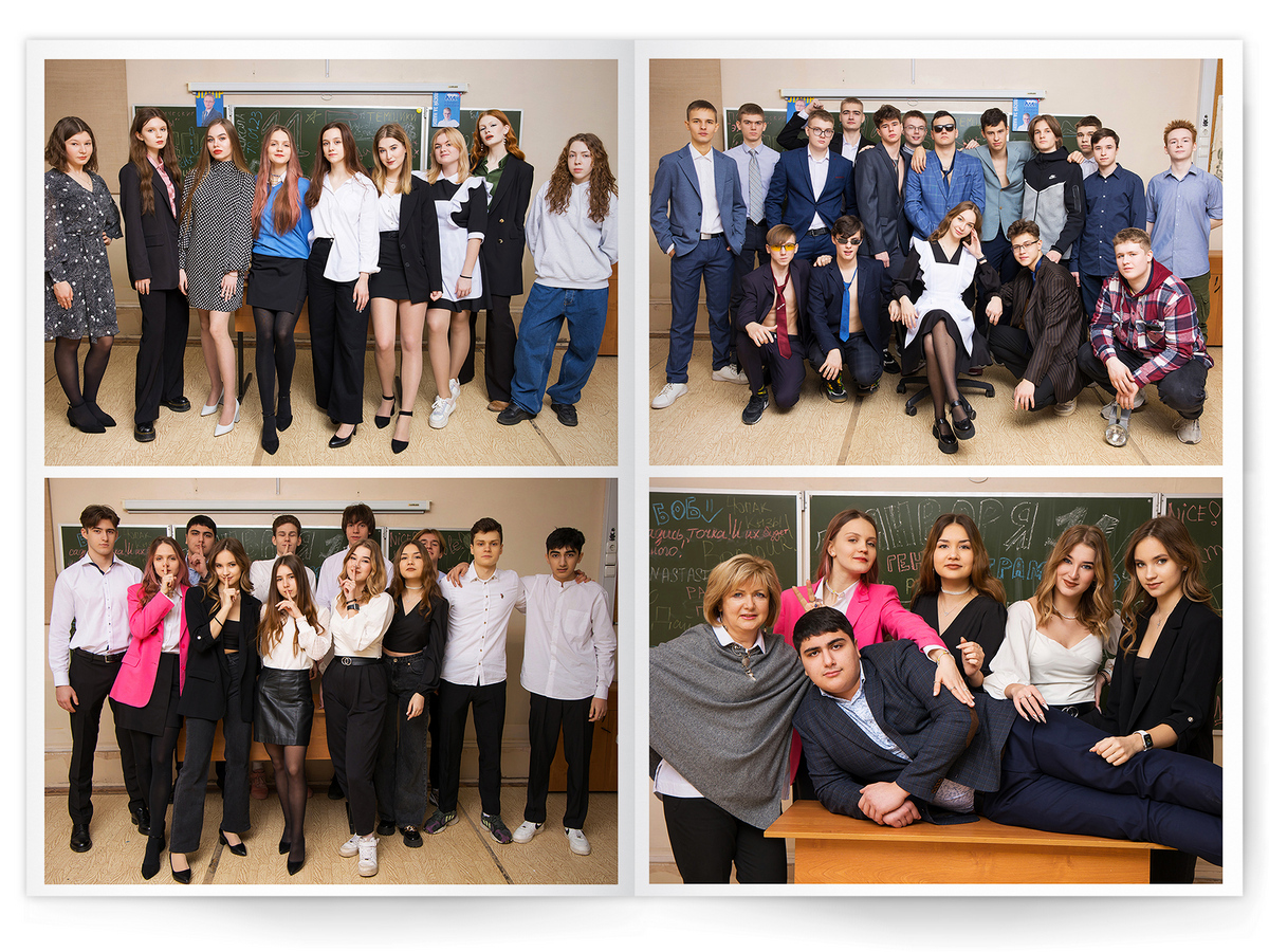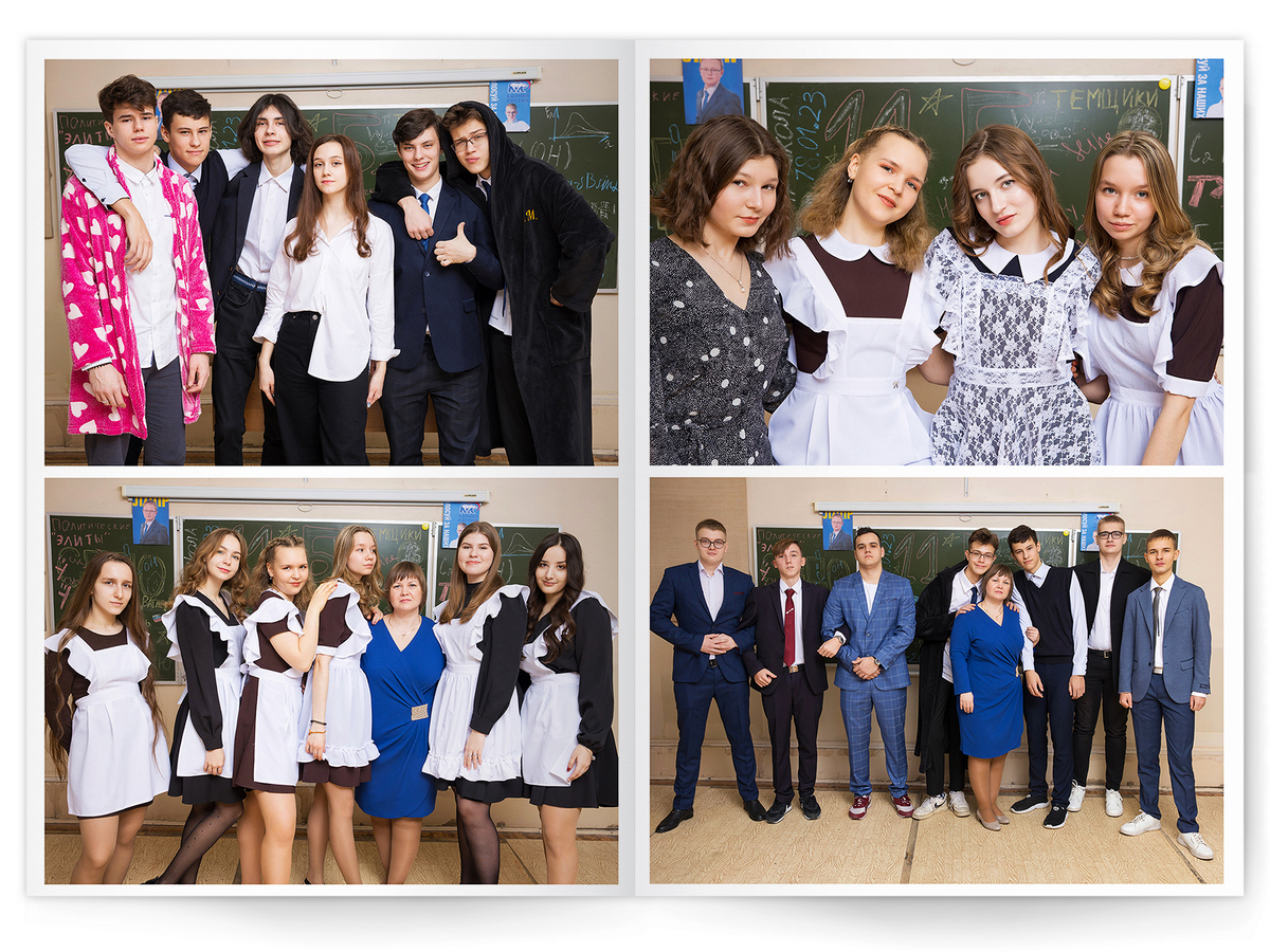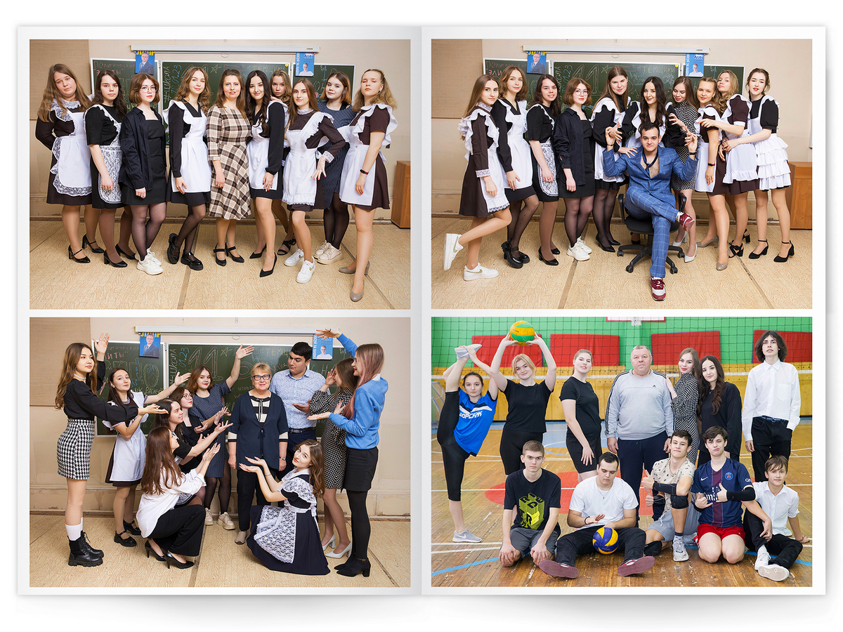 • Портреты всех одноклассников и все учителя, которые придут на съёмку на развороте